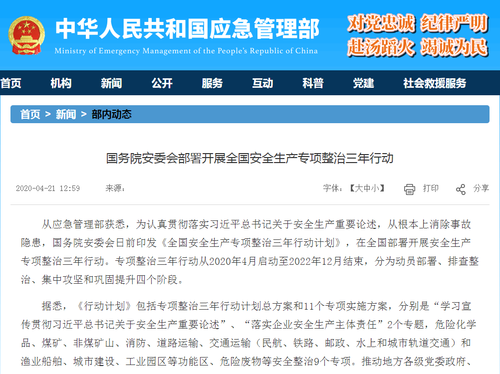 《行動計劃》包括專項整治三年行動計劃總方案和11個專項實施方案,分別是“學習宣傳貫徹習近平總書記關于安全生產重要論述”、“落實企業(yè)安全生產主體責任”2個專題,危險化學品、煤礦、非煤礦山、消防、道路運輸、交通運輸(民航、鐵路、郵政、水上和城市軌道交通)和漁業(yè)船舶、城市建設、工業(yè)園區(qū)等功能區(qū)、危險廢物等安全整治9個專項。