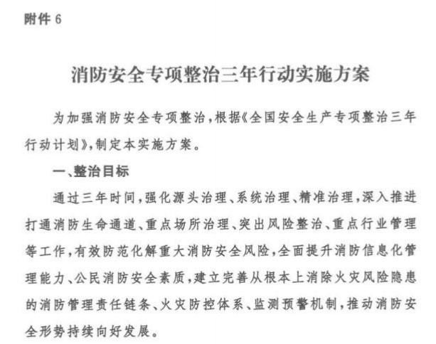 通過三年時間,強化源頭治理、系統治理、精準治理,深入推進打通消防生命通道、重點場所治理、突出風險整治、重點行業(yè)管理等工作,有效防范化解重大消防安全風險,全面提升消防信息化管理能力、公民消防安全素質,建立完善從根本上消除火災風險隱患的消防管理責任鏈條、火災防控體系、監(jiān)測預警機制,推動消防安全形勢持續(xù)向好發(fā)展。集中整治高層建筑、大型商業(yè)綜合體、城市地下軌道交通、石油化工企業(yè)以及老舊場所、新材料新業(yè)態(tài)等場所領域的消防安全突出風險隱患。建立健全風險研判、精準治理、源頭管控的火災風險防范化解機制,全面應用大數據、物聯網信息化技術,依托智慧城市建設,分級建成城市消防大數據庫,實時化、智能化評估消防安全風險。2022年底前,全國火災監(jiān)測預警預報平臺基本建成,差異化精準監(jiān)管全面推行。(1)推行城市消防大數據管理。各地區(qū)結合電子政務、智慧城市建設以及城市信息化大數據系統建設,結合監(jiān)督管理、歷史火災等內部信息,共享匯聚融合相關行業(yè)數據資源。2022年底前,分級建成城市消防大數據庫,建成火災監(jiān)測預警預報平臺,實現對火災高風險場所、高風險區(qū)域的動態(tài)監(jiān)測、風險評估、智能分析和精準治理。(2)建設消防物聯網監(jiān)控系統。各地區(qū)積極推廣應用物聯傳感、溫度傳感、火災煙霧監(jiān)測、水壓監(jiān)測、電氣火災監(jiān)控、視頻監(jiān)控等感知設備,加強消防安全智能化、信息化預警監(jiān)測,實現消防數據物聯感知、智能感知。2021年,地級以上城市全部建成消防物聯網監(jiān)控系統。各地區(qū)、各有關部門對本地區(qū)本行業(yè)消防安全風險隱患全面排查,建立問題隱患和制度措施“兩個清單”,明確排查時間表、整改路線圖、工作責任人,繼續(xù)發(fā)動社會各方面力量群策群力、群防群治,確保各項排查任務精準推進落實。各地區(qū)、各有關部門對照前期排查的“兩個清單”,堅持由表及里、由易到難,細化各項治理舉措,實施差異化整治。存在重大火災隱患的,全面落實政府掛牌督辦和跟蹤整治,強化政策支持,配套資金保障,確保按時整改銷案,達到預期治理效果。各地區(qū)、各有關部門結合實際,在推進消防安全突出風險隱患整改的同時,分析共性問題,研究治本之策,因地制宜出臺一批配套舉措、形成一批經驗做法,建立健全本地區(qū)本行業(yè)防范化解重大消防安全風險的系統性、機制性治理舉措,提升整體治理水平。