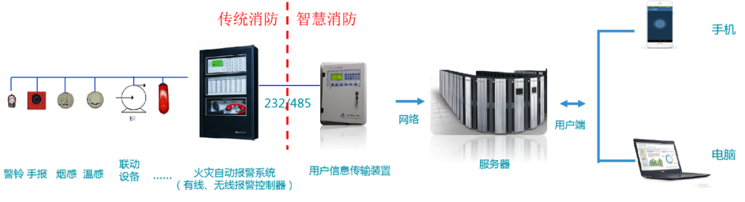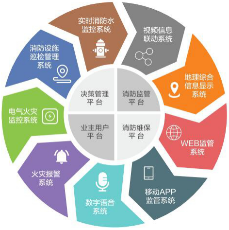 智慧消防物聯網綜合平臺由前端感知傳輸設備(火災報警監(jiān)控系統、消防水監(jiān)控系統、電氣火災監(jiān)控系統等)、傳輸網絡、系統監(jiān)測軟件平臺、系統管理軟件平臺(手機APP等)組成。